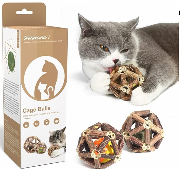 Potaroma Catnip Toys, 3Pcs Cat Toys Natural Silvervine Stick Cage Balls & Bell Ball for Indoor Cats, Kitten Cleaning Teeth Molar Matatabi Cat Chew Toy All Breeds